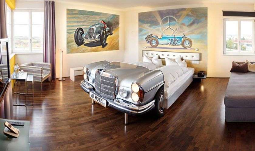 V8 Hotel — часть выставочного центра Motor World в ангаре на бывшем аэродроме. Отель занимает здание диспетчерского центра в стиле ар-деко. В лобби отеля выставлена коллекция гоночных болидов, самые заслуженные из них — 1920-х годов. Автомобили использованы и в интерьерах номеров отеля: кровати во многих комнатах — своего рода кентавры, где передняя часть сделана из капота винтажного авто Volkswagen Beetle, Mercedes или Morris Minor. Есть номер «Автомойка» с огромными щетками, «Кинотеатр под открытым небом» — с «кадиллаком» и «Route 66» с портретом Джеймса Дина и тентом над кроватью.