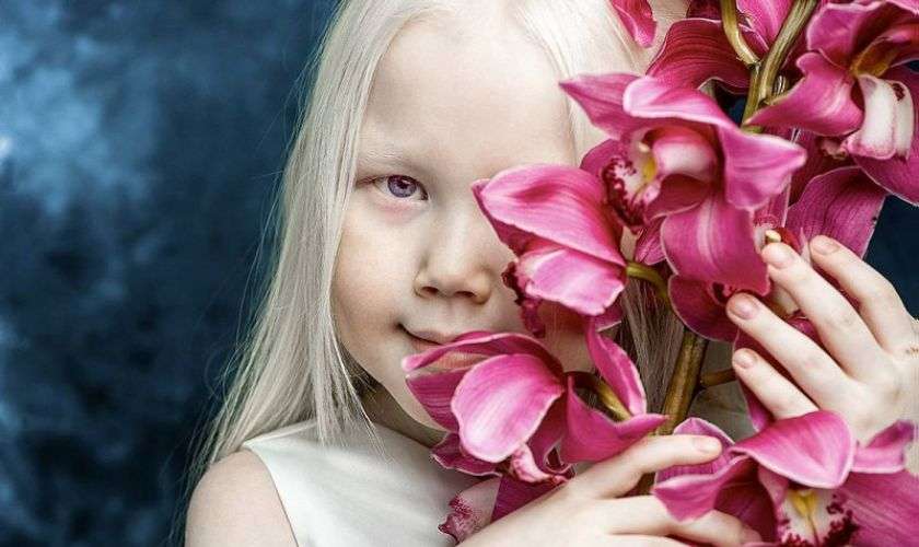 У 8-летней Нарияны народности саха загадочная, даже сказочная внешность. Природа подарила девочке-альбиносу фарфоровую кожу, белоснежные ресницы и меняющие цвет глаза, которые она обычно защищает от солнца темными стеклами очков.