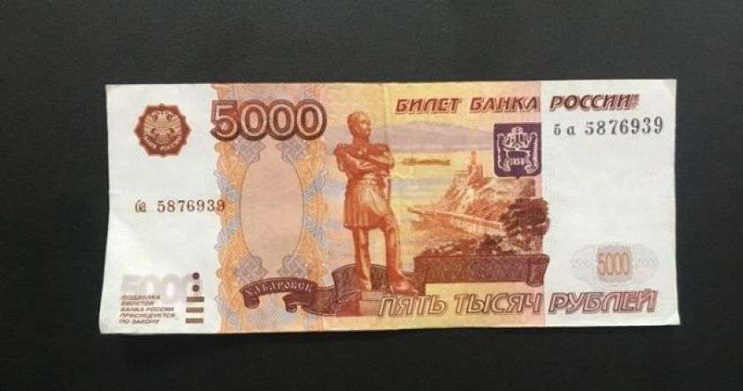 К этой купюре достоинством в 5000 рублей не придерешься: есть защита, водяные знаки, магнитная лента и перфорация. Но если ее хорошенько осмотреть и прощупать, то можно заметить, что это склеенная из двух отдельных сторон фальшивка.