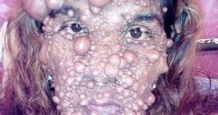После рождения своего второго ребенка 38-летняя Шармен Сахадео покрылась огромным количеством опухолей (нейрофиброматоз) и стала выглядеть как персонаж фильма ужасов. Из-за аномалии 18-летний брак Шармен развалился, и с деньгами стало совсем худо, поскольку работодатели приходят в ужас от одного ее вида.