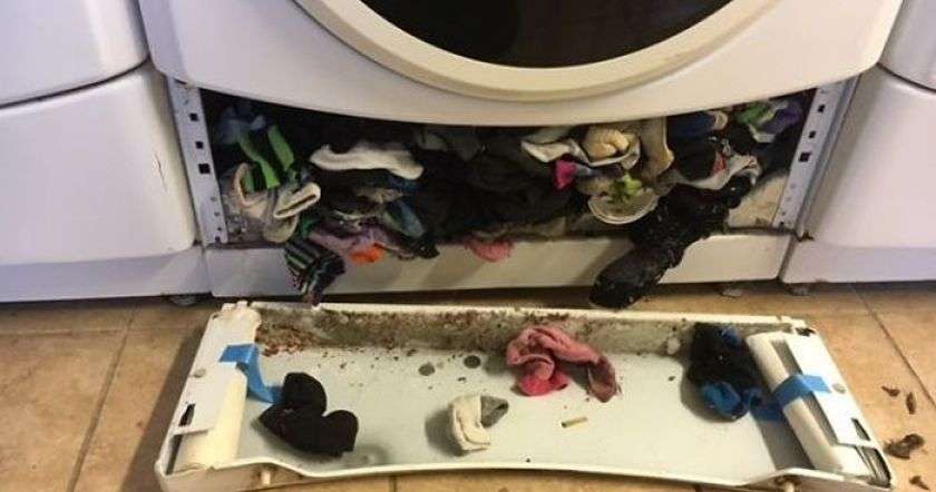 В прачечной жилого комплекса начала барахлить стиральная машина, и было решено вызвать мастера. Прибывший специалист оперативно нашел причину - ею оказалась огромная куча всевозможных носков. Теперь понятно, куда они волшебным образом исчезают.