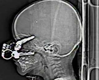 На данном рентгеновском снимке вы можете видеть штырь от железного забора, проткнувший щеку молодого человека.