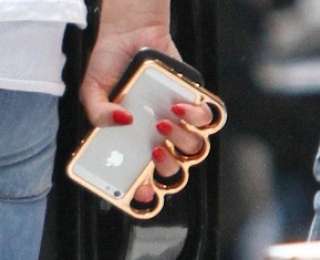 Кэмерон Диас попалась на съемках “Другой женщины” с очень опасным айфоном. Барышня несла свой телефон в чехле-кастете. Разумеется, это все уловка: кастет пластиковый и сделан не для драки, а для удобства ношения телефона в руке. Моду на него ввела Рианна еще в 2012 году, но алюминивые версии были запрещены к продаже как холодное оружие, и остались только пластиковые копии.