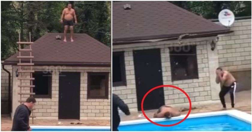 Подвыпивший мужчина долго собирался совершить прыжок с крыши небольшой постройки в бассейн. За кадром слышна армянская речь, друзья пытаются его отговорить, но тот нецензурно им отказывает. В самый ответственный момент край крыши предательски отваливается под упитанным товарищем и он смачно прикладывается головой прямо о плитку (смотри 0:50).