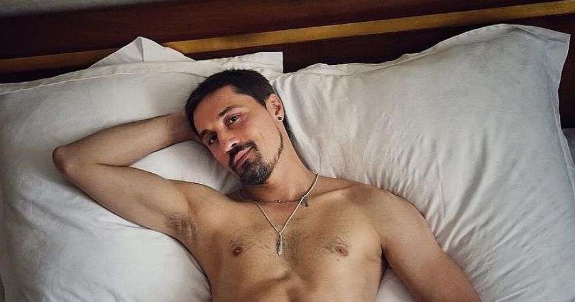 Артист позирует с голым торсом, прикрыв половой орган полотенцем. При этом Дима загадочно улыбается, демонстрируя накачанный пресс и буйную растительность на теле.