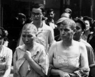 4. Очевидец тех событий: "Мимо нас, под аккомпанемент ругани и угроз, медленно ехал открытый грузовик. В кузове было около дюжины женщин, все — с обритыми наголо головами, низко опущенными от стыда". Кадры хроники — олицетворением этих слов.