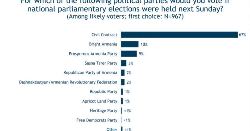 67% респондентов заявили, что если бы выборы состоялись в следующее воскресенье, то они проголосовали бы за партию «Гражданский договор», 10% — за «Просвещенную Армению», 9% — за «Процветающую Армению», 3% — за партию «Сасна црер», 2% – за Республиканскую партию Армении , 2% — за АРФ «Дашнакцутюн».