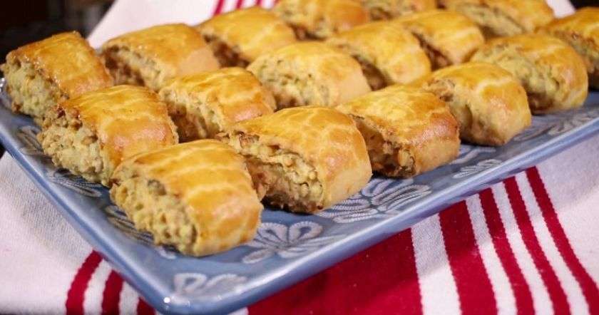 - Выложи кусочки рулета на противень и смажь их взбитой смесью желтка, сахара и растительного масла.