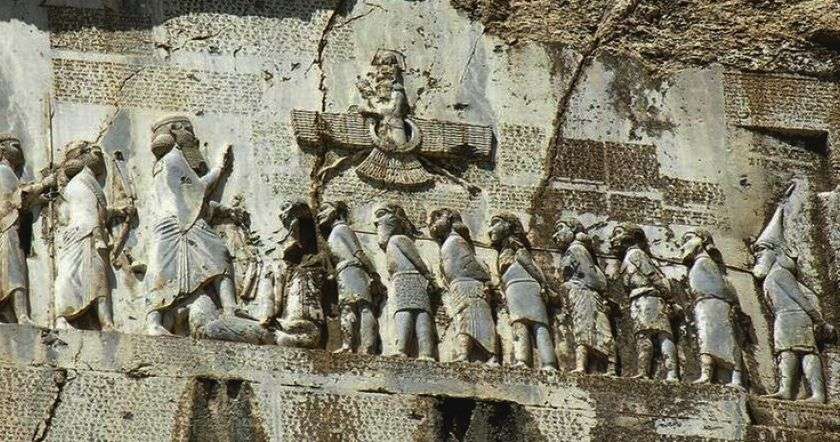 Первые годы правления великого царя Дария I ознаменовались кровавыми восстаниями во всех концах персидской державы. После тяжёлой борьбы все их удалось подавить. Исполненный благодарности к Ахурамазде, который дал победу законному монарху над царями лжи, Дарий увековечил память об этих тяжких победоносных войнах и выражение своей признательности к верховному богу зороастризма. В верховьях реки Хоаспа, в прохладной, обильной родниками местности, где, по преданию, Семирамида построила себе загородный дворец в парке и велела изваять в скале барельефную группу, изображавшую ее и сто копьеносцев вокруг, Дарий распорядился изваять изображения его подвигов на стене утеса горы Багистана («жилища богов»; ныне – гора Бехистун).
