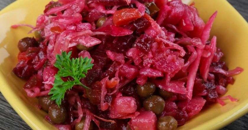 В классический винегрет входит и такой продукт, как квашеная капуста. Чтобы она не испортила блюдо своим особенным вкусом, предварительно промой ее под проточной водой. Если капуста кажется слишком кислой, то залей ее теплой водой на 5–6 часов.