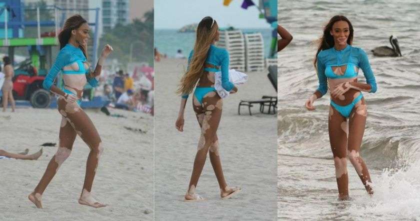 24-летняя канадская фотомодель и активистка Винни Харлоу (Winnie Harlow) в бикини на пляже в Майами. Она получила известность как участница двадцать первого сезона «Топ-модель по-американски», известна тем, что сделала карьеру модели, страдая от витилиго, нарушения пигментации кожи. В настоящее время является лицом казуального бренда одежды Desigual в Барселоне, наряду с бразильской супермоделью Адрианой Лимой.