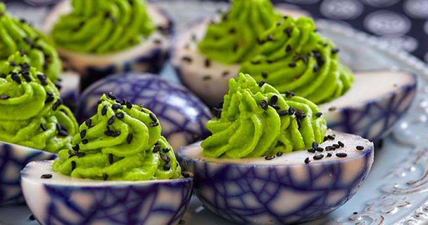 - С помощью ложки или кондитерского шприца нафаршируй яйца начинкой. Посыпь мраморные яйца черным кунжутом и выложи на тарелку. Блюдо на Хэллоуин готово.