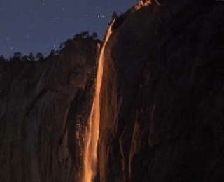 Нет, это не лава — так было бы слишком просто. Водопад Лошадиный Хвост (Horsetail Fall) начинает светиться каждый февраль: на протяжении двух недель солнечные лучи падают на него под таким углом, что водопад выглядит так, будто состоит из пламени — это явление часто называют огнепадом. Обычно огнепад можно наблюдать всего минут десять на закате в случае, если облака не закрывают небо.