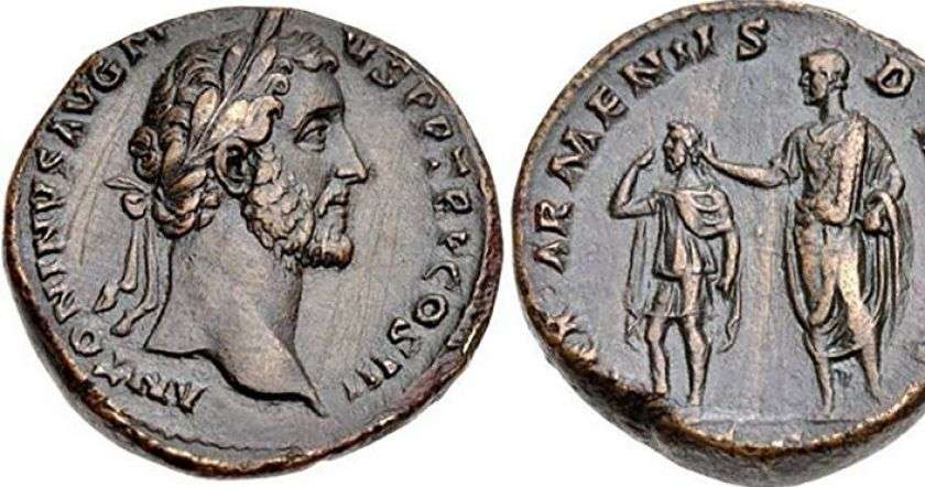В ту сложную и запутанную для Армении эпоху царь Тигран V Сохемос всходил на армянский престол аж целых два раза (144-161 и 164-186 гг. нашей эры). В первый раз царская корона досталась ему из рук римского императора Антонина Пия (Antoninus Pius). Именно это событие запечатлено на первой бронзовой монете: на аверсе (главной стороне монеты) изображен император и его имя, а на реверсе (оборотной стороне) — коронация Сохемоса и надпись на латинском: “Царя Армении дал” (Rex Armen Dat). После смерти императора Антонина Пия парфянское войско совершает нашествие на Великую Армению, наносит сокрушительный удар Сохемосу и передает власть своему ставленнику, царю Бакуру I, а Сохемос перебирается в Рим.