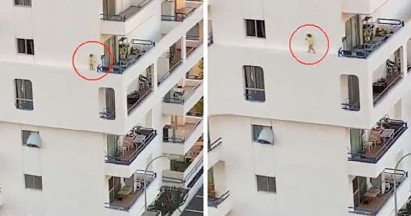 На кадрах, снятых с соседнего жилого комплекса, неназванный ребёнок достиг перил балкона, после чего, вместо того, чтобы перелезть через балкон в безопасное место, развернулся и вернулся тем же путем, каким и пришёл, едва не сорвавшись вниз в считанных сантиметрах от окна.