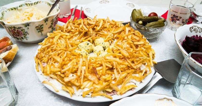 Многим красиво оформленное птичье гнездо с яйцами посередине кажется слишком сложным, но мы постараемся вас переубедить. Скажем сразу: салат не только калорийный и очень сытный, но и настолько же вкусный, а его приготовление по силам даже начинающей хозяйке.