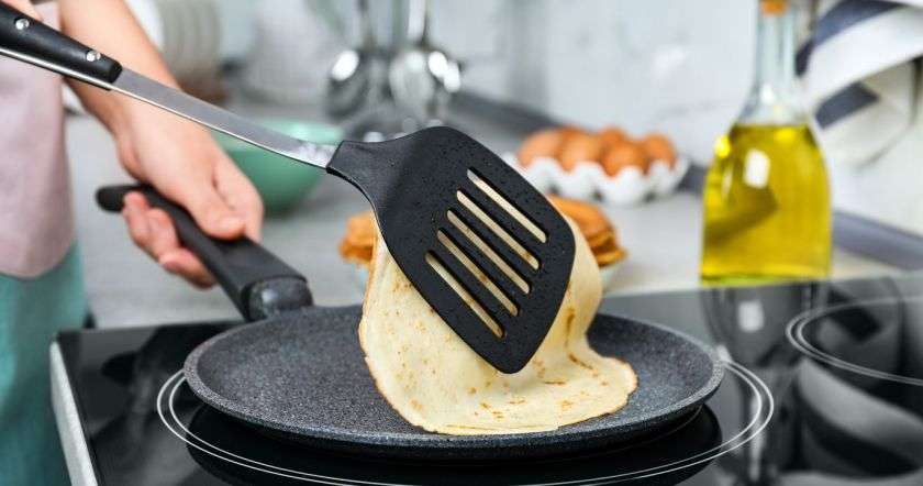 Деревянная лопатка — лучший выбор для готовки. Однако ловко поддеть и перевернуть ею тонкие блинчики бывает сложно из-за толщины лопатки.