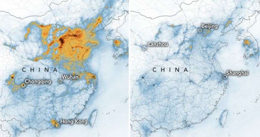 Спутниковые снимки показывают, что уровень загрязнения воздуха в Китае заметно сократился, сообщает "Би-би-си" со ссылкой на данные НАСА.