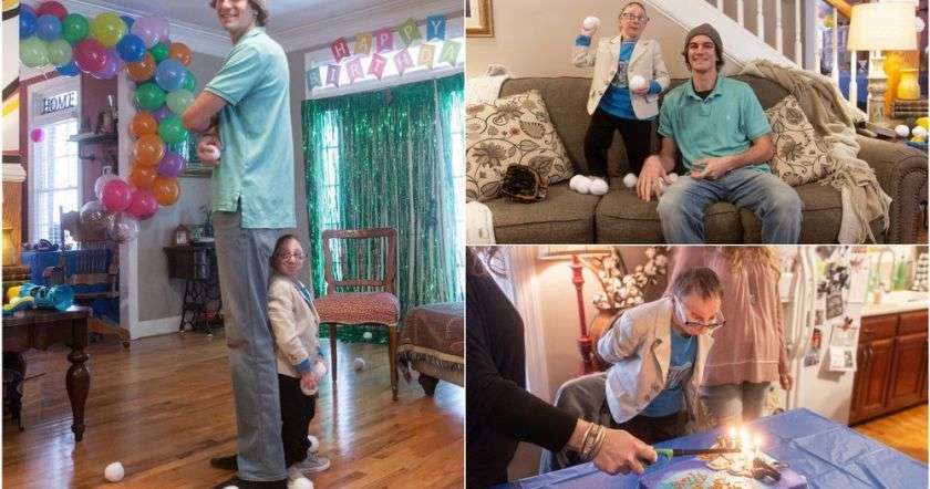 28-летний парень из Джорджии, США, на снимке изображён стоящим рядом со своим 6-футовым 5-дюймовым (195 сантиметров) 25-летним братом Леви (Levi), который с радостью помог своему старшему брату отпраздновать его особый день.