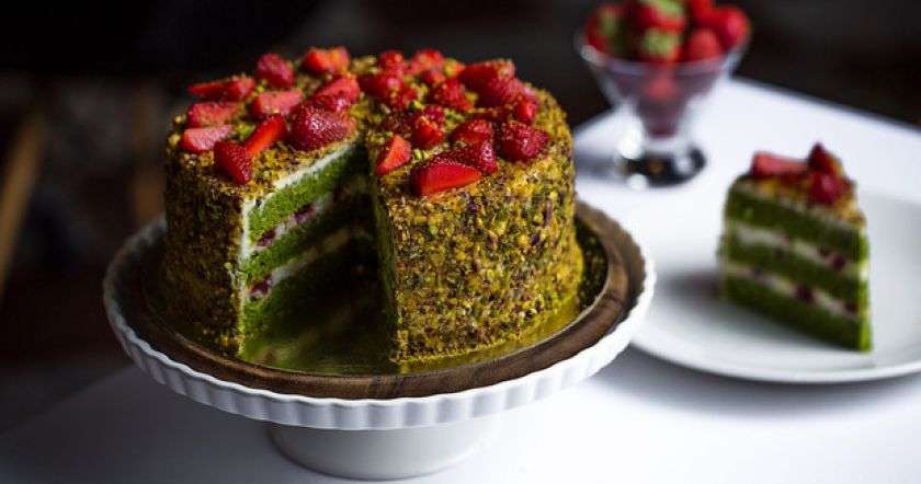 - Посыпаем торт фисташками и выкладываем сверху клубнику.