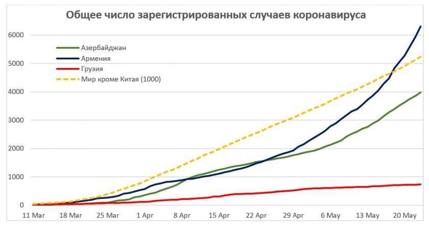 В дискурсах руководства Армении регулярно возникал вопрос об искажении статистики. То говорили про Грузию (вчера вообще министр здравоохранения своими высказываниями вызвал в Грузии скандал), то про Россию, и все время так с приколом, что мол может нам тоже начать фальсифицировать цифры? (см. также: Коронавирус на Кавказе: «грузинский пример» и «армянский ответ»). В действительности цифры не фальсифицируют, но добавлена графа «умершие с коронавирусом» - такой графы нет ни в Азербайджане, ни в Грузии. И нет соответствующего зазора в статистике. Поэтому вышеприведенный график для Армении следует скорректировать.