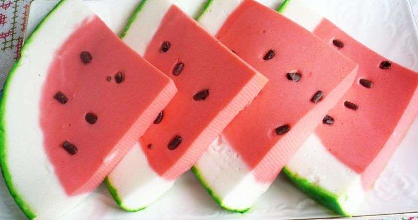 А далее с помощью кулинарной кисточки нанеси зеленый краситель, имитирующий «корку арбуза», на белую каемку суфле.