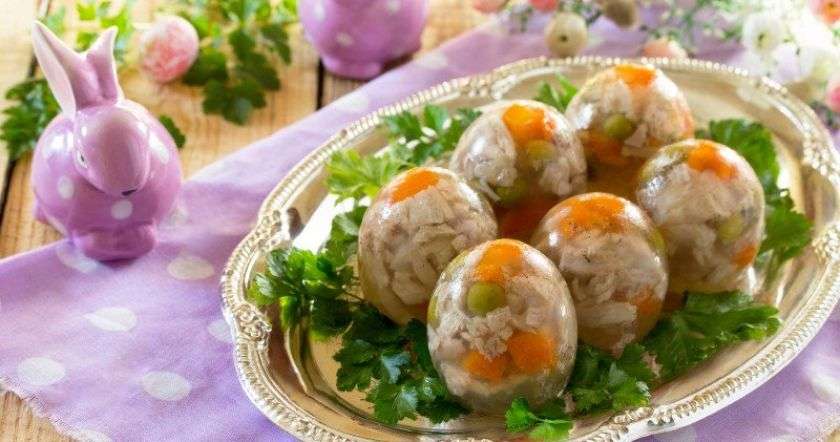 - Теперь в произвольном порядке добавляй остальные продукты. Старайся не жадничать с мясными ингредиентами, это же вкусное праздничное блюдо. Не утрамбовывай ингредиенты, пускай они будут уложены до самой верхушки скорлупы, но нужно оставить место для бульона с желатином.