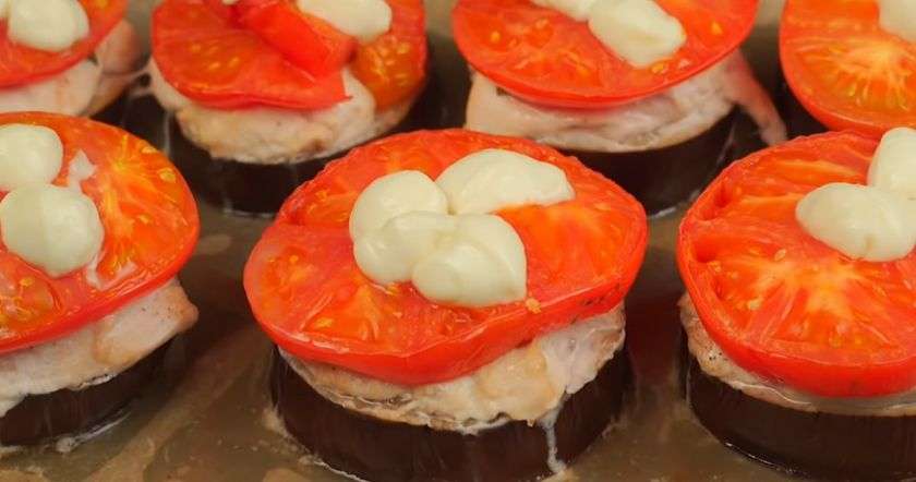 - Затем порежь куриное филе на небольшие плоские кусочки и выложи их на баклажаны. Посоли и поперчи мясо по вкусу. После выложи по 1 листику свежего базилика на каждую порцию блюда. Но если у тебя есть только сушеный базилик, смело используй его.