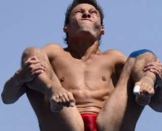1. Украинский спортсмен Илья Кваша совершает прыжок с метрового трамплина в воду.