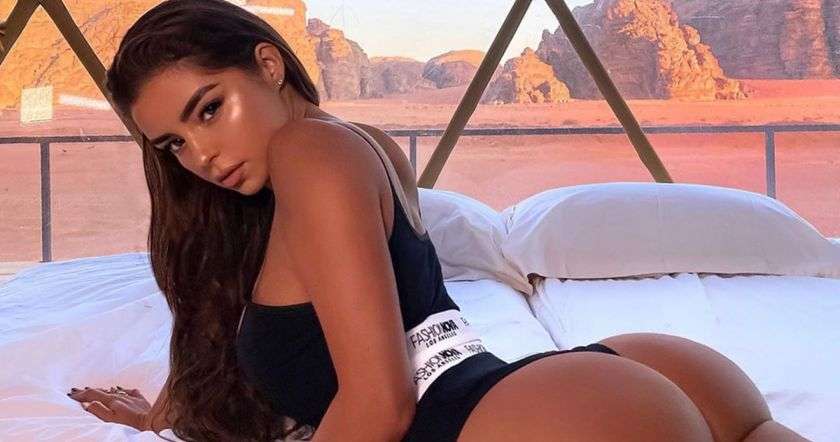 На размещенном кадре манекенщица позирует топлес в велосипедках лилового цвета, прикрывая обнаженную грудь толстовкой в тон. Ее сфотографировали на фоне зеркала с распущенными волосами. Из аксессуаров на знаменитости — несколько колец. Данным снимком она прорекламировала продукцию бренда Boohoo.