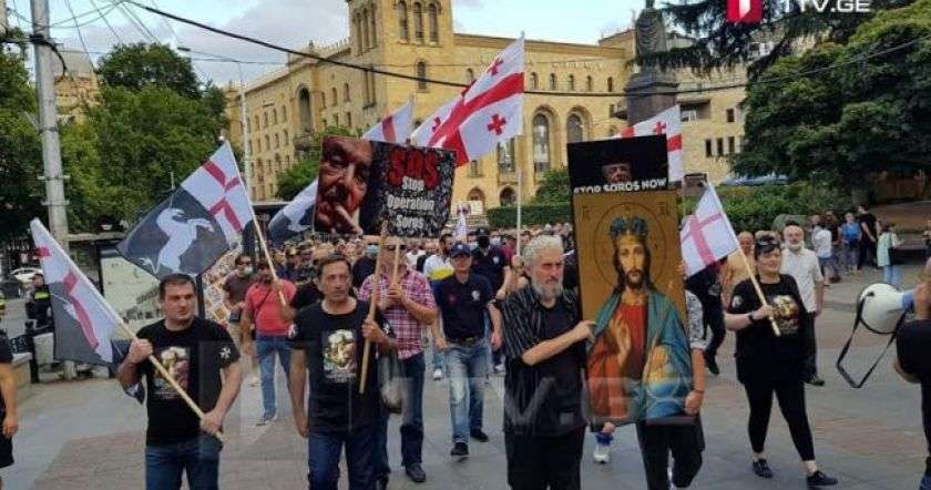 Политическое объединение «Грузинский марш — национальное движение» проводит в центре Тбилиси очередную акцию протеста с требованием запретить функционирования офиса Фонда открытое общество (фонд Сороса) в стране.