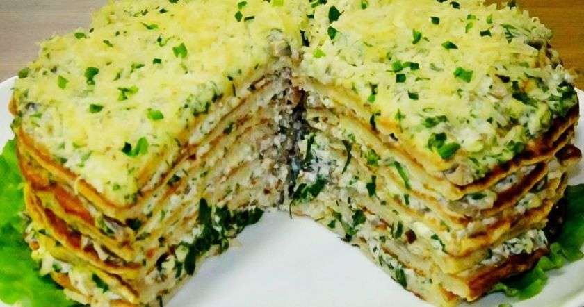 Ставь на плиту сковороду, смажь ее маслом и потихоньку начинай выпекать основу — блинчики, из которых позже соберешь пирог. Их должно получится 7 или 8. Обжаривай их с обеих сторон до готовности. Ставь их остывать и займись начинкой. Натри на терке огурцы и выжми жидкость. Так же натри оливки и плавленый сыр.
