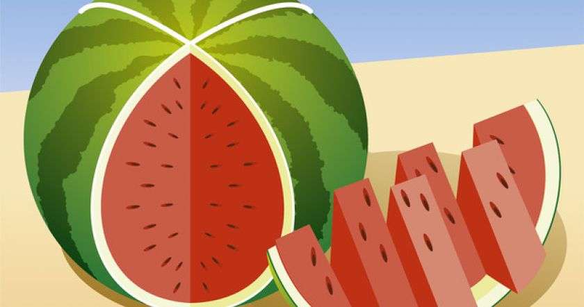 Снова разрежь арбуз на четвертинки или используй те, что остались от предыдущего эксперимента. Возьми одну, наруби на ней дольки шириной в сантиметр. Затем глубоко прорежь мякоть вдоль с каждой стороны двумя-тремя параллельными линиями. А после подрежь мякоть вдоль корки по всей ширине и длине. Теперь переверни над тарелкой — туда высыпятся кубики мякоти. В них можно воткнуть зубочистки. Ешь по кубику, смакуя тонкие ноты фруктозы. Это быстро надоест, и съешь мало.