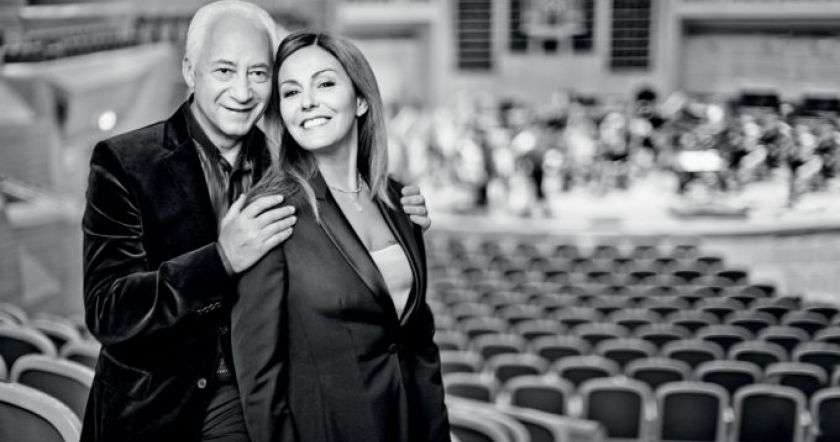 ВЛАДИМИР И САТИ СПИВАКОВЫ В СВЕТЛАНОВСКОМ ЗАЛЕ МОСКОВСКОГО ДОМА МУЗЫКИ. НА САТИ: ШЕРСТЯНЫЕ ЖАКЕТ И БРЮКИ, ШЕЛКОВЫЙ ТОП, ВСЕ DIOR; КОЛЬЕ ИЗ БЕЛОГО ЗОЛОТА С БРИЛЛИАНТАМИ, DAVID MORRIS.