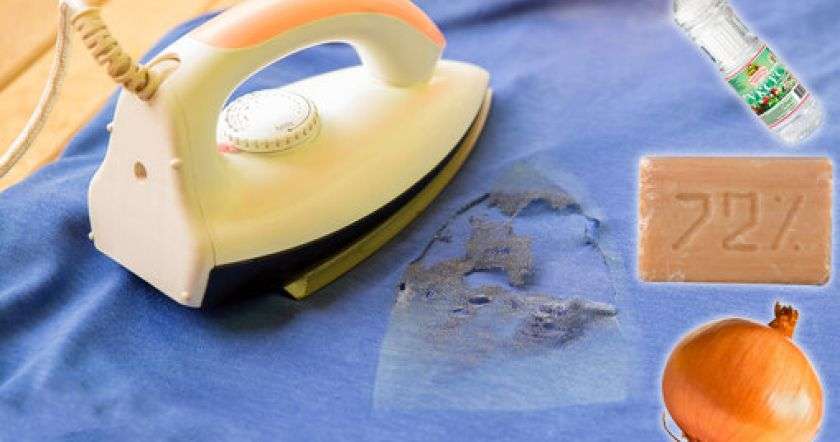 - Чтобы избавиться от белых следов от утюга, используйте луковицу. Измельчите её до кашицы, нанесите на пятно и потрите. Оставьте на несколько часов. Затем замочите одежду в холодной воде примерно на два часа. Постирайте при температуре 30–40 градусов.