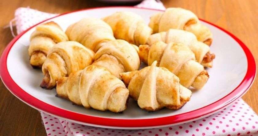 - Выкладываем начинку на более широкий край каждого из треугольников. Сворачиваем рогалики и отправляем их на смазанный маслом противень. Если есть время, можно накрыть рогалики полотенцем и оставить в теплом месте на 1 час. Таким образом они поднимутся и обретут приятные округлые формы. Закончив с этим, помещаем рогалики в разогретую до 180 ℃ духовку на 20–30 минут.