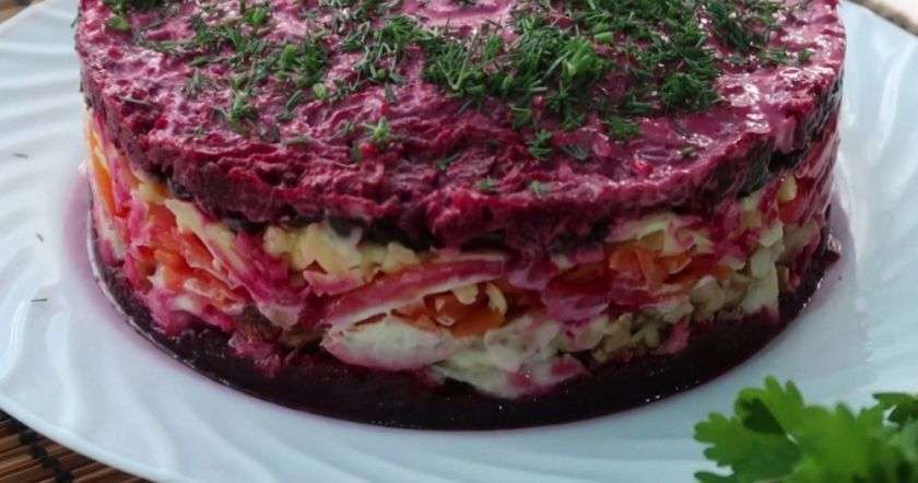 - В конце остается лишь собрать салат. Первым слоем выкладываем половину свеклы, затем курицу, а сверху присыпаем всё измельченными орехами. Далее добавляем майонез, морковь и сыр, а затем снова сдабриваем всё майонезом.