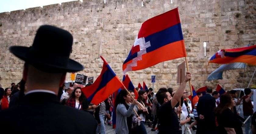 Проармянские протестующие направлялись в Иерусалим в длинной колонне автомобилей, с окрашенными в красный, синий и желтый цветами, составляющие армянский флаг.