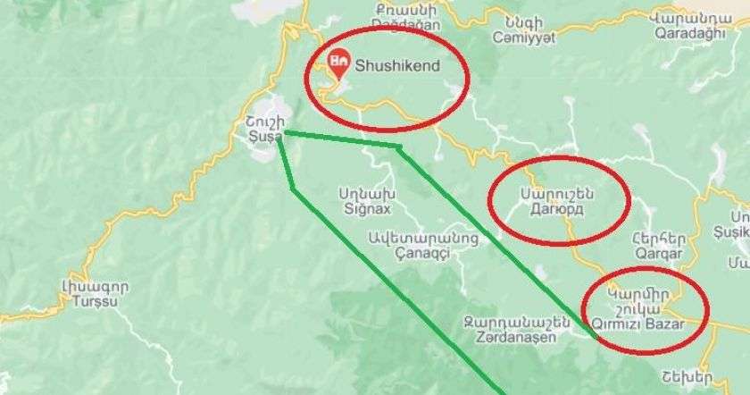 Так или иначе, теперь азербайджанцам понадобилось отвести войска и технику (то ли ротация, то ли вывод), но сделать это они могли только в сопровождении российских миротворцев через арцахские сёла (выделены красным) на юг.