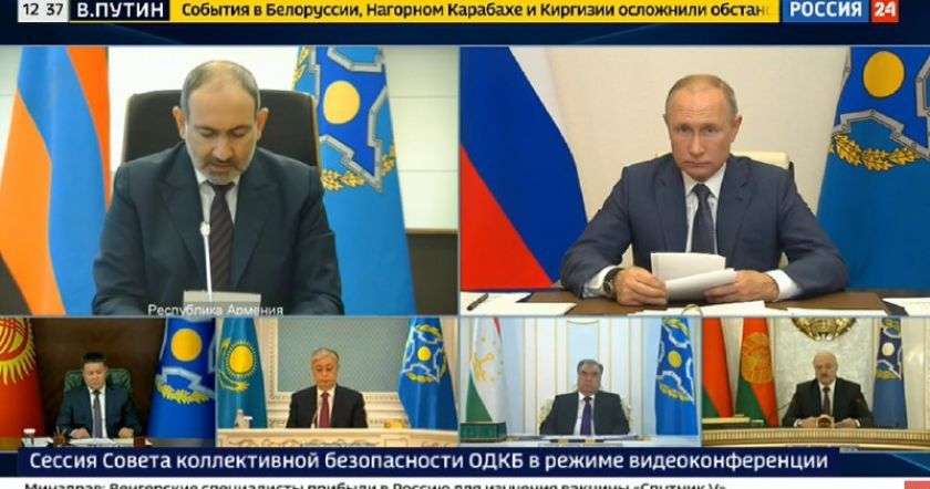 — Обстановка на пространстве, входящем в сферу ответственности ОДКБ, складывалась не без проблем и в целом была неспокойной,— доложил коллегам Владимир Путин.— Имею в виду вспыхнувший в сентябре вооруженный конфликт в районе Нагорного Карабаха с участием государства—члена ОДКБ, а также послевыборные события в Белоруссии, которая столкнулась с беспрецедентным давлением извне, и внутриполитическую ситуацию в Киргизии тоже имею в виду.