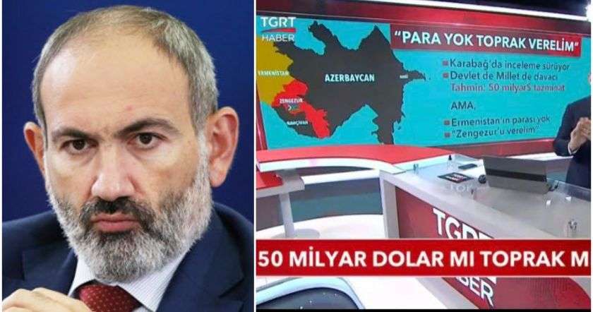 Вчерашний репортаж турецкого телеканала TGRT News: внимательно посмотрите на карту и флаг. Международно признанные границы Армении преподносятся общественности, как часть территории Азербайджана с цитатой: «У Армении нет денег. Отдадим Зангезур».