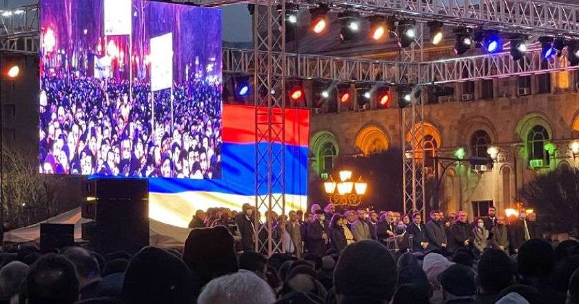 Народ есть, сторонники Пашиняна, которые орут после его особо удачных истерических визгов, собрались вокруг сцены. Основная масса, это наблюдатели и силы полиции. Пашинян говорит без остановок. Чистейший Гебельс.