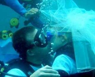 Если невеста согласна отказаться от шикарной свадебной прически, то ее можно уговорить на проведение свадьбы на морском дне. Правда, у глубоководной свадьбы есть свои минусы. Во-первых, для этого нужна специальная подготовка, а во-вторых, вряд ли получится пригласить гостей. Но если вы не боитесь трудностей и хотите побыть наедине со своей прекрасной невестой, то живописное морское дно – очень неплохой вариант.