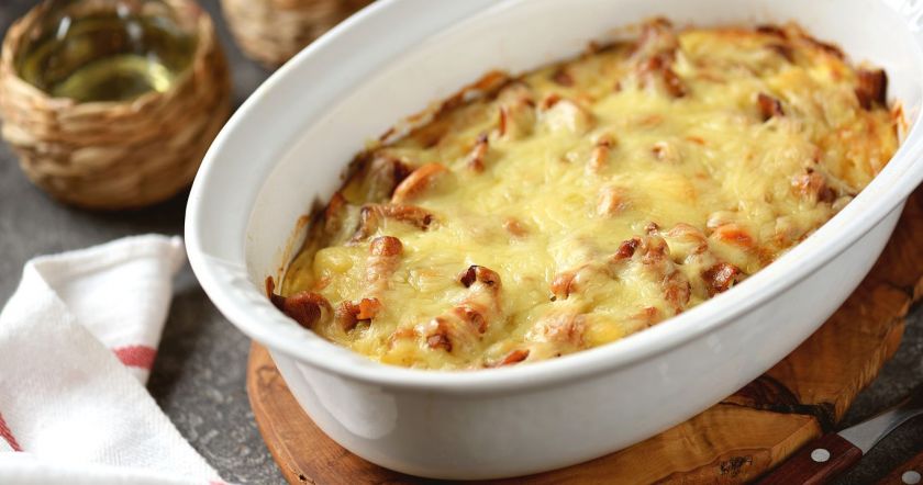 Затем соединить грибы с картофелем и молоком и вылить все в форму. Запекать 35-45 минут. Через 15-20 минут от начала приготовления посыпать запеканку тертым сыром.