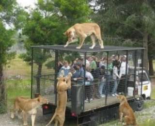 6. Четыре пассажира джипа, наверное, почувствовали на себе дыхание смерти, когда лев запрыгнул на капот за своим завтраком. Однако всё это часть аттракциона. Джип позволяет посетителям зоопарка увидеть львов с невероятно близкого расстояния.
