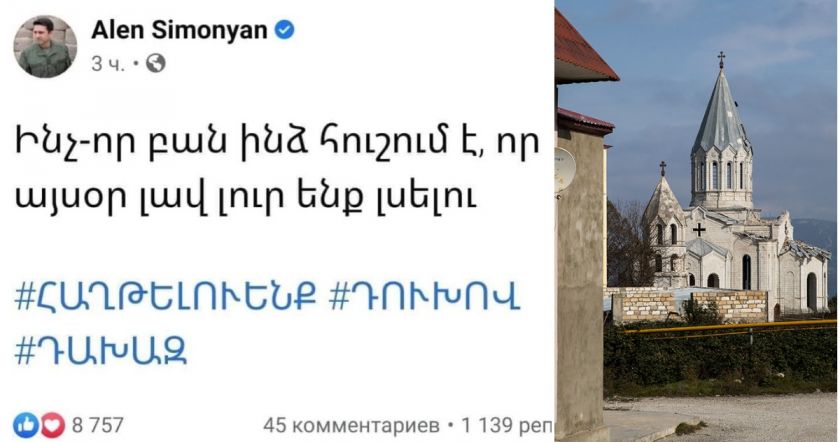 Ровно год назад, когда Шушан Степанян сообщила о двух потерянных позициях в Мартуни, Арцрун, находясь на площади, сквозь шум благотворительного концерта чисто по инерции визжал про победим, МО публиковало список убитых, а ВВП два дня подряд рвал телефоны алиева и пашиняна, Ален Симонян томно ожидал хороших новостей. Он, видимо, знал, что через 6 дней его хозяева получат в дар джбахт/джгуйн Шуши. Армения оккупирована азеро-турецкими коллаборационистами, против которых сегодня развёрнуто Армянское Национально-Освободительное Движение Сопротивления, основные тезисы которого озвучены блоком «Армения»: нет отуречиванию Армении, нет деармянизации Арцаха, нет новому соглашению, нет демаркации и делимитации, нет коридорам и нет оккупационным властям. В движении будут использованы инструменты массового информирования, протесты и стачки.