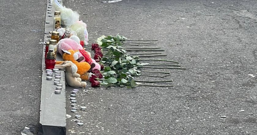 На месте убийства девушки и ребёнка своеобразный поминальный алтарь на бордюре. Кто принёс свежие розы, кто зажег свечу, а кто-то мягкую игрушку для малыша.