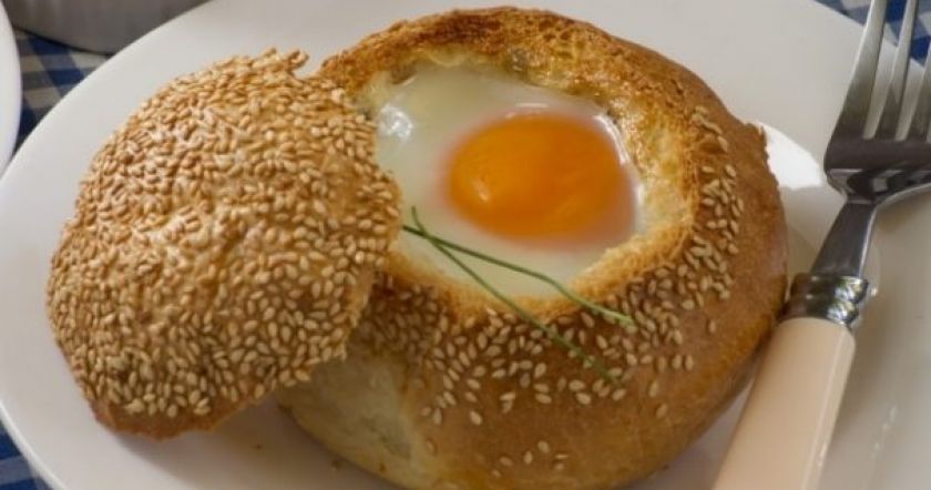 - Нагрейте духовку до 160 С. Срежьте верхушки с булочек, извлеките часть мякиша, чтобы внутрь поместилось целое сырое яйцо.