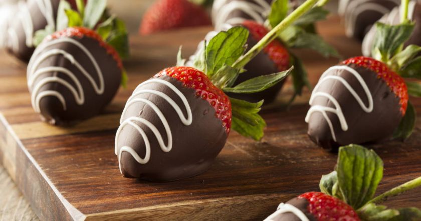 - Достаньте из морозилки клубнику. Насадите каждую ягоду на деревянную шпажку, обмакните ее в растопленный шоколад, оставляя плодоножку чистой.