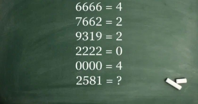 Если присмотреться к примерам повнимательнее, то можно понять, что закономерность выявляется так: нужно посчитать кружочки в числах слева (так, в цифре 8 — два кружка, в 9 — один). И тогда получается, что 2581 = 2.